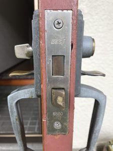 こちらの扉は木製の玄関扉にWEST社の錠前が付いており、錠ケース(下)には【WEST 5500】と刻印があるサムラッチ錠と上部にはチューブラ本締まり錠がついており、カギの形状は『ギザギザ』タイプの一般キーが付いていました。