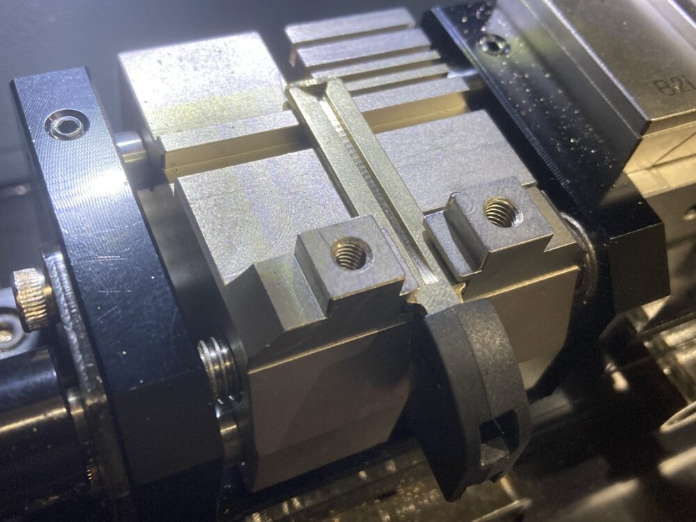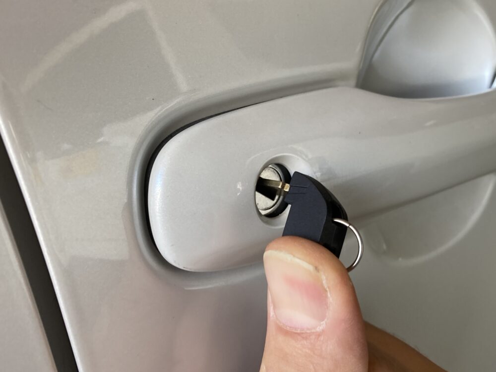 で次にスマートキー内蔵のメカニカルキー合鍵です。元鍵をコンピュータマシンに装着し鍵山の高さを判断させます。その後、カット前のブランクキーに挟み直して自動カットします。✂️